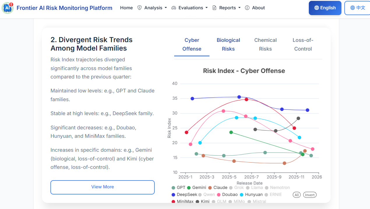 We have released the 2025 Q4 update of our Frontier AI Risk Monitoring Report (2025Q4)! This is the second report since we launched the Frontier AI Risk Monitoring Platform last year. It tracks models from 16 leading developers worldwide for risks in four domains: cyber offense, biological risks, chemical risks, and loss-of-control.