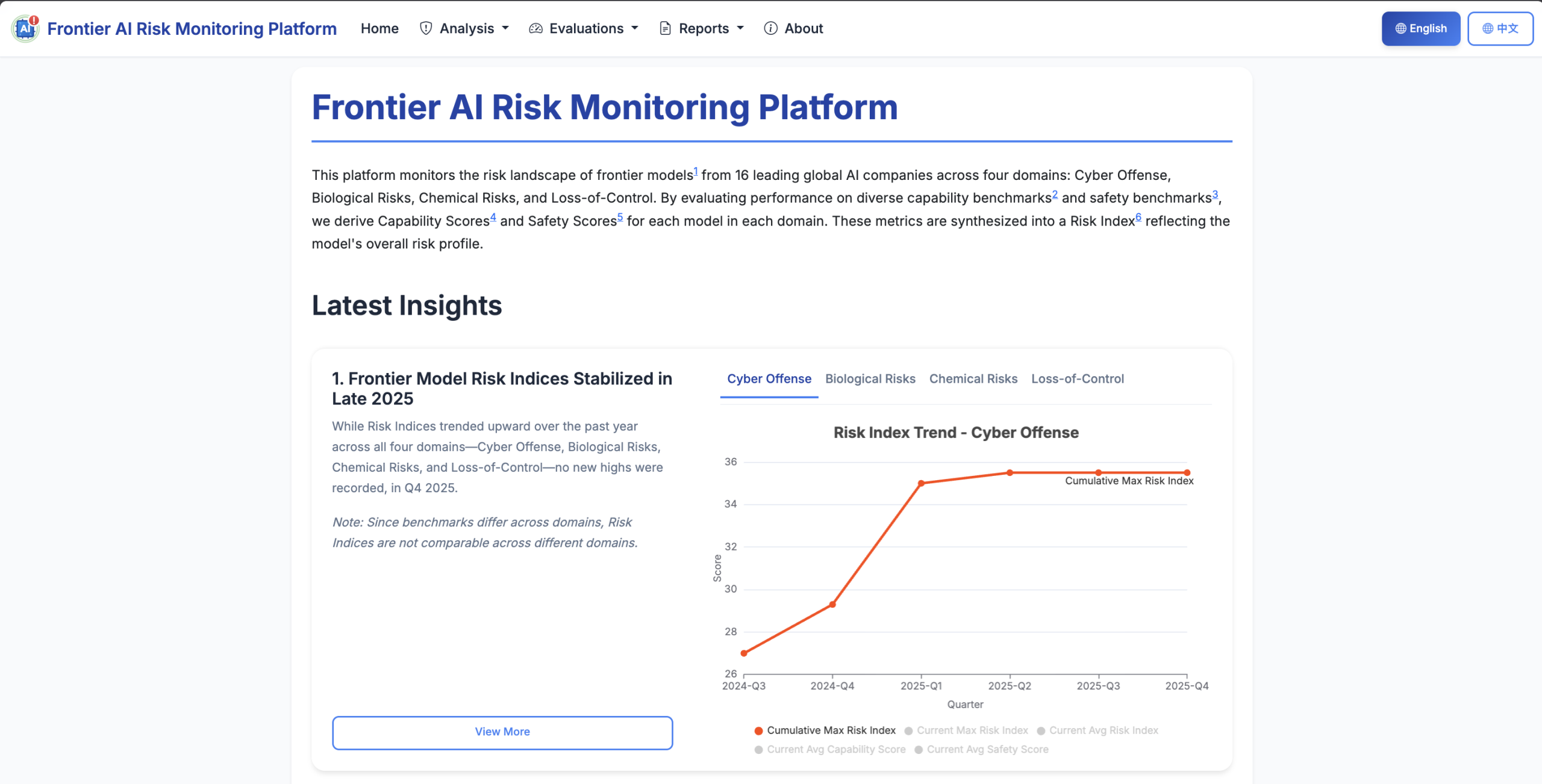 - Launched the AI Risk Monitoring Platform designed to track and mitigate frontier AI risks, including cyberoffense, biological threats, chemical threats, and loss of control domains. The platform evaluates 50 frontier LLMs from 15 leading developers across the US, China, and France, using 18 open source benchmarks. Key outputs include a risk index dashboard and a detailed technical report. This project was spearheaded by our AI Safety Research Senior Manager WANG Weibing (王伟冰).