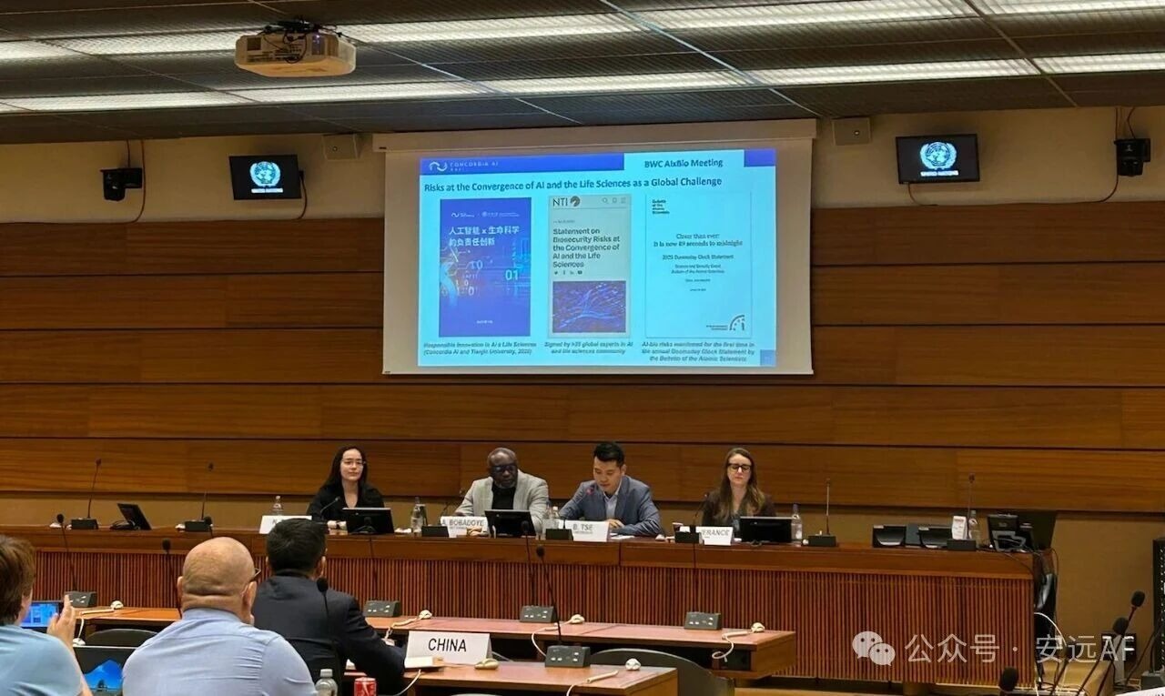 Concordia AI CEO Brian Tse speaking at the United Nations side event during the Sixth Expert Meeting of the Working Group on strengthening implementation of the Biological Weapons Convention (BWC) in Geneva. Source: Concordia AI. International research and public engagement
