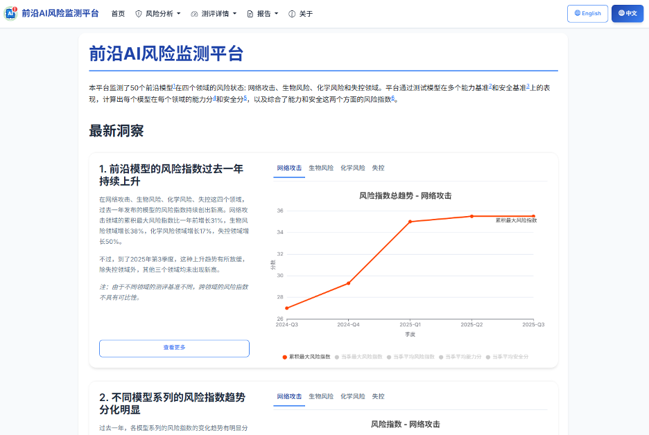 2025年11月7日,安远AI发布了国内首个前沿AI风险监测平台,并同时发布了首份前沿AI风险监测报告(2025Q3)。该平台追踪了全球15家领先AI公司的50个前沿模型在四个领域的潜在灾难性风险:网络攻击、生物风险、化学风险和失控。平台发布得到了人民日报、新华社经济参考报、南华早报、IT时报、智幻时刻等媒体的报道。